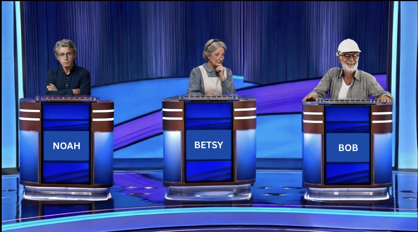 🎶 Doo doo doo, doodoo doo doo doo. Doo doo, doo doo - doot! da doodoo doodoo….🎶 That song’s been running through my head for the last sixty of seventy years1. An earworm, it follows me around crawling, wriggling, boring into my mundane existence. Did you know it lasts exactly thirty seconds? It’s perfect to hum when gargling or washing your hands. You can even cook a decent soft-boiled egg by singing it six times over. It’s good for any task that needs timed when a watch isn’t handy. Providing, of course, you are synced to the rhythm. Lord knows, after 60 years of daily replays, I am synced. But the optimal use of the song, the one it was written for, is to tick off the thirty seconds you have to answer, in the form of a question, Final Jeopardy!.