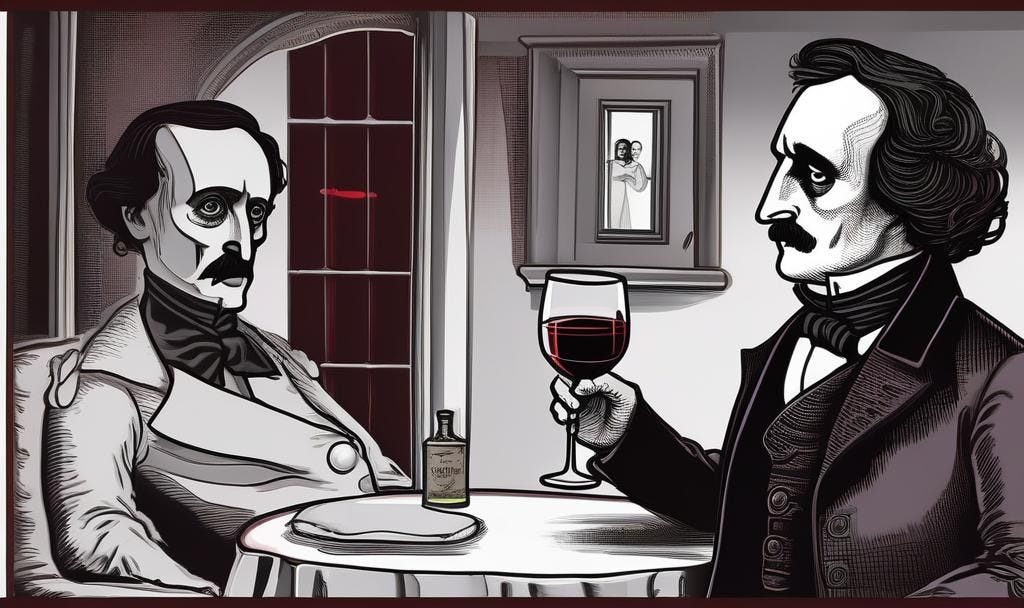 “Well, smooth, sweet nepenthe. Of that I must have more,” says Poe. “I must get my hat and depart thee. I must get to the store. Then, I am headed to my chamber. I feel an urge, a pressing urge to write ever more.”